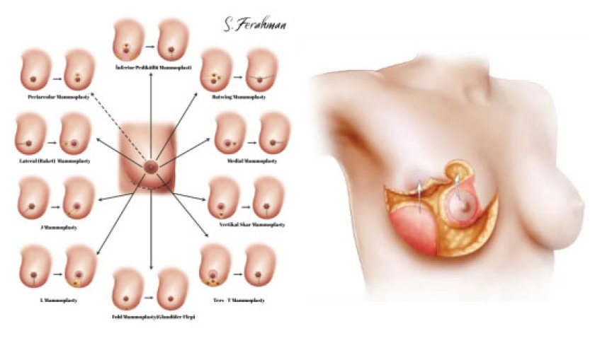 Wise Pattern: Ters T skar tekniğiyle büyük dokular çıkarılır, meme yeniden biçimlendirilir.